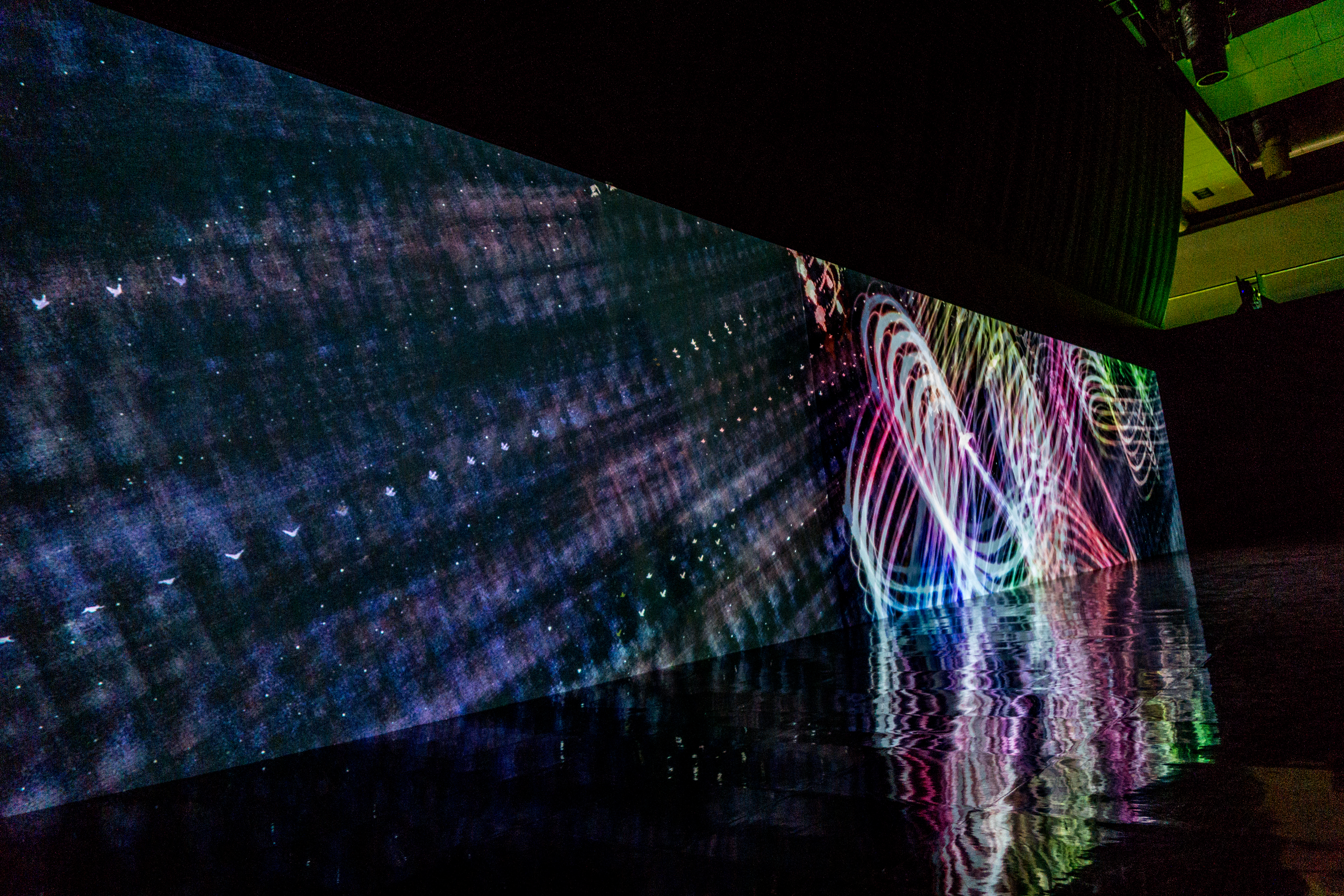 In the first room the projections on the wall were activated by human interaction, creating a dream-like experience filled with light, sound and music. Falling Japanese characters representing nature (such as wind, water and fire) floated across the walls, bursting into colourful animations with every human touch. When activated (by placing a hand on the Japanese characters) each of the animations would interact with one and other resulting in some amazing landscapes projected across all four walls of the room. Projections of birds, butterflies and the elements of nature were accompanied by a majestic orchestral soundtrack that seemed to ‘explode’ with the animations on the wall. Just amazing!