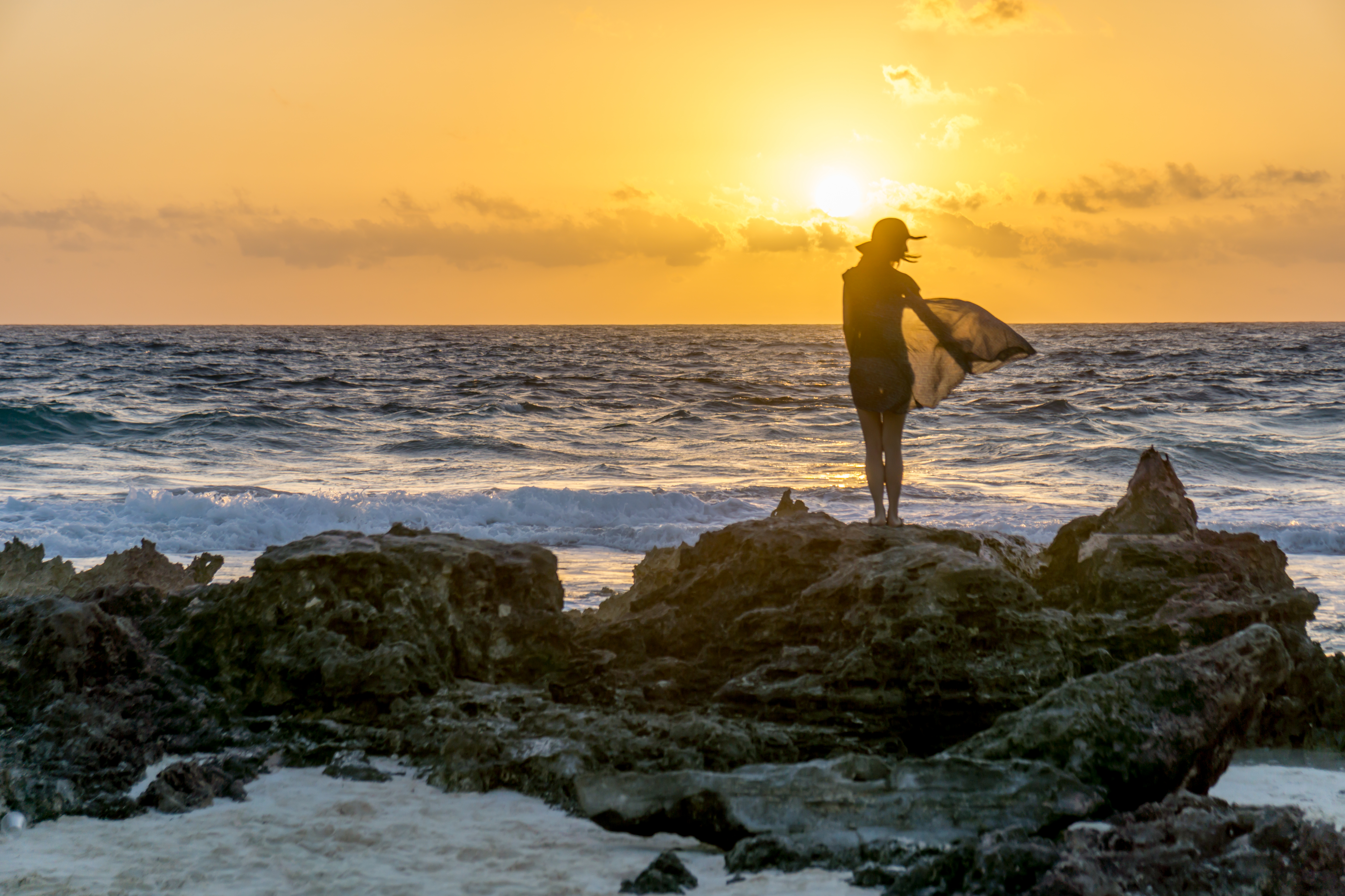 The next day, we woke up at dawn for a walk down to the beach to watch the sunrise and catch a morning dip in the water before the wave of tourists arrived. Lucky for us the beach was only a 2 minute walk from the hotel, so we got changed and went for a ‘light jog’ (we believe it’s a soft ‘j’…) to the Eastern end of the beach. The breeze on this side of the island was much stronger, making for some awesome kaftan floating in the wind and man-bun silhouette photos as the sun rose up over the horizon!