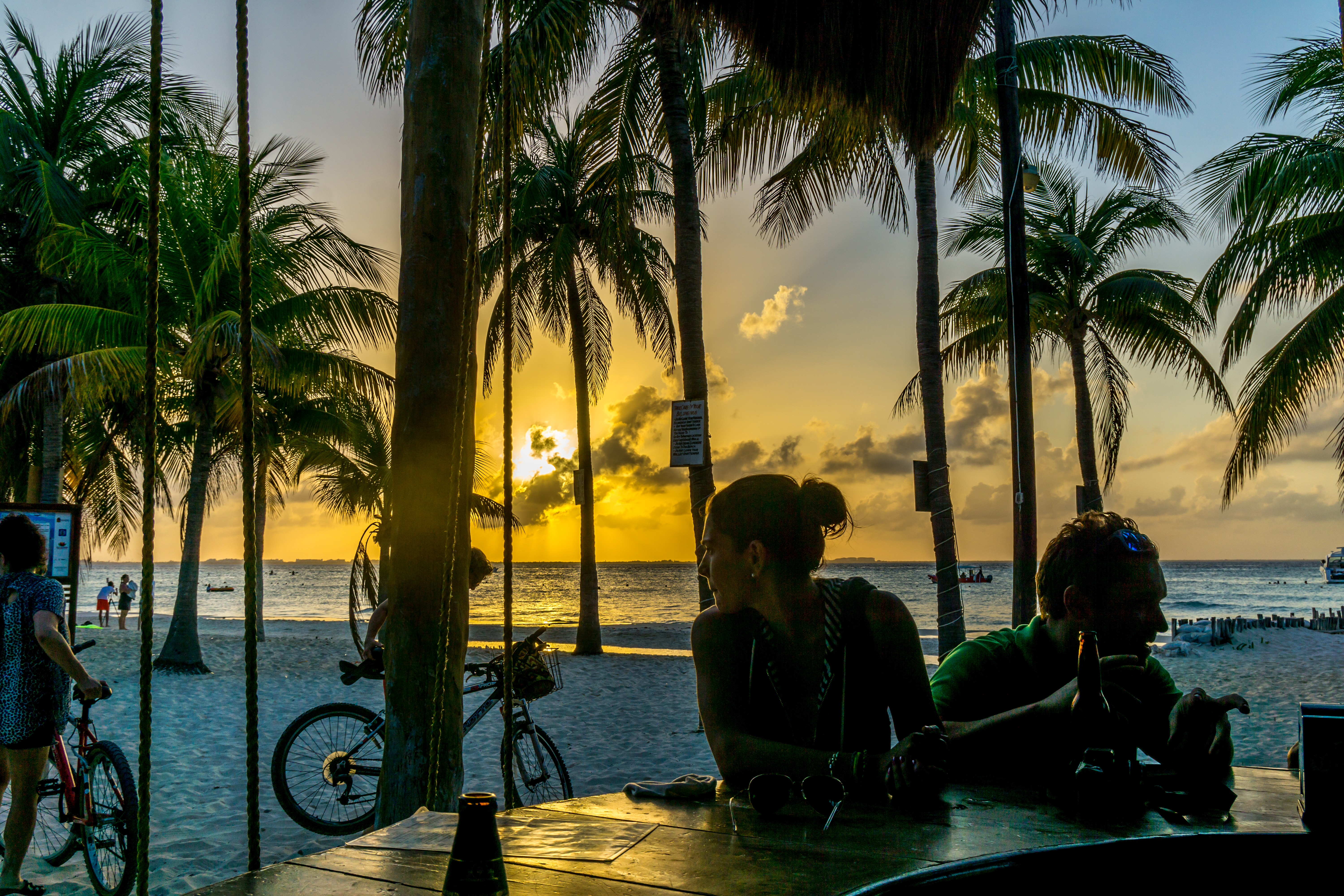 To experience our first ever Central American sunset we took a walk along the beach to Buho’s, an outdoor beach bar complete with swings for chairs and a view across the beach towards the sun setting over Cancun. It was a great day of rest and recuperation from our long journey the day before, sipping chilled Sol beers as the sun went down over the horizon.